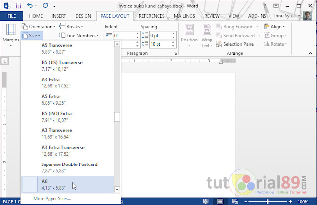 1. Buka Microsoft word sobat. Kemudian aturlah ukuran kertasnya menjadi ukuran A6. Ukuran ini adalah ukuran standar kwitansi yang sering kita jumpai dipasaran.